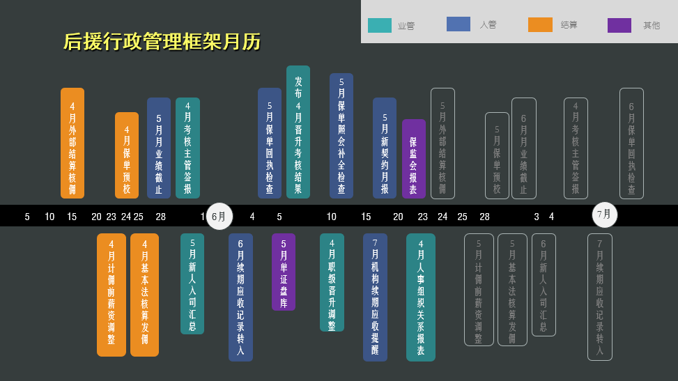 :idea: 首先梳理:你们公司的行政后援管理的行事历,并以此确定种子教官的人员名单及负责的任务安排。