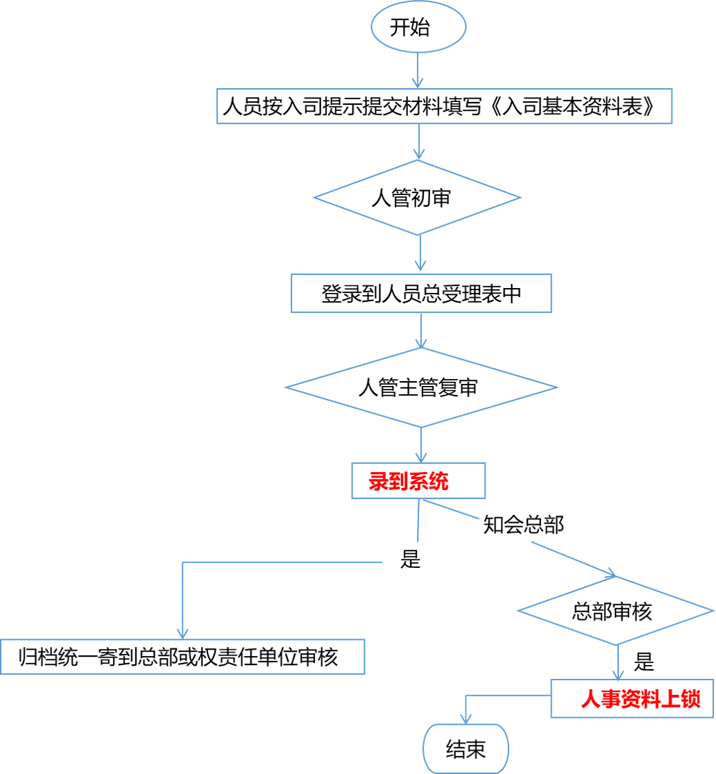新人入司按入司规定提交材料及填写《入司基本资料表》予人管受理,人管初审后登录到《人员受理总表》中,后提交给人管主管单位来复审或交由总部来复审,最终将改新人的报到手续完成并上锁为止。