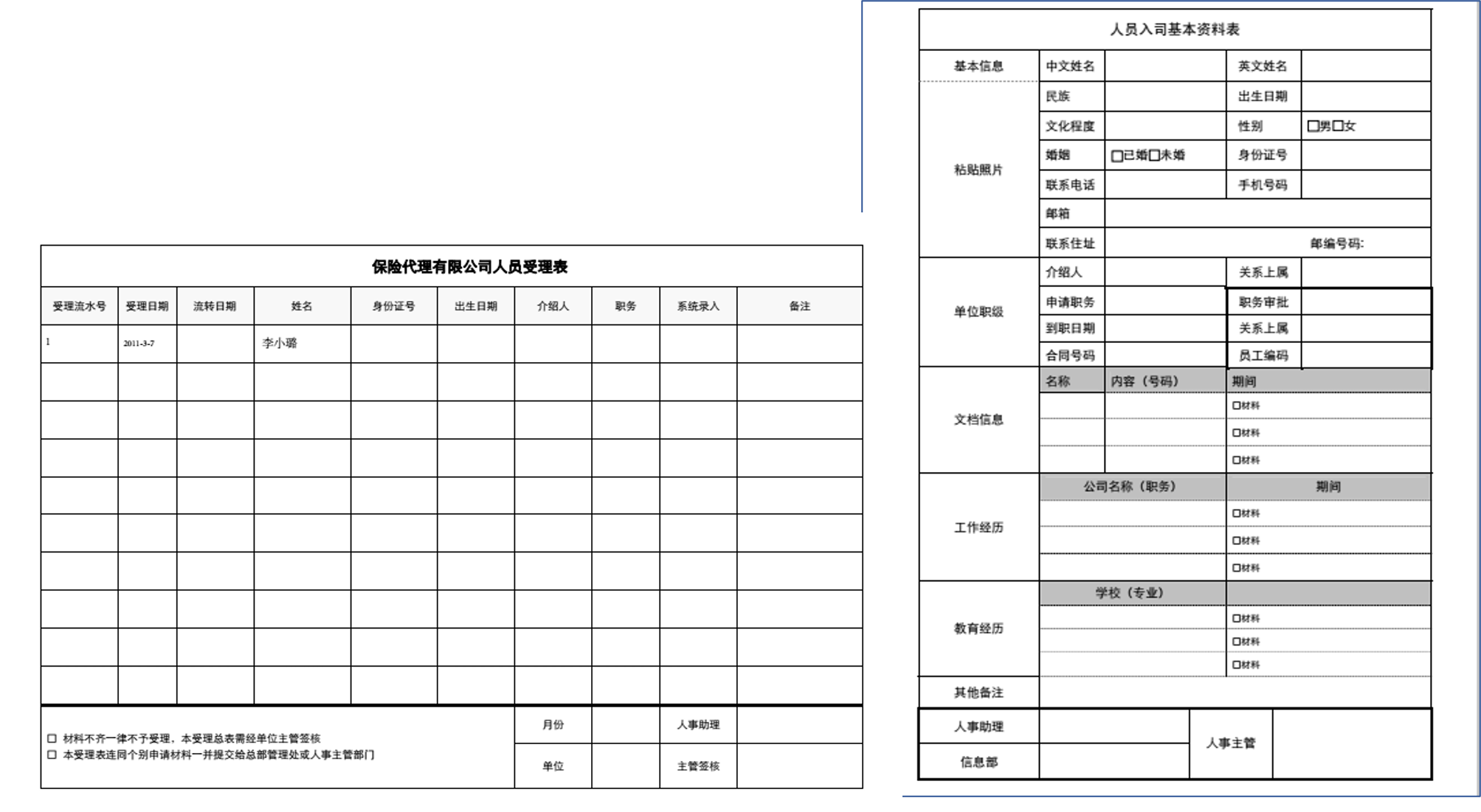 人员入司相关的表格