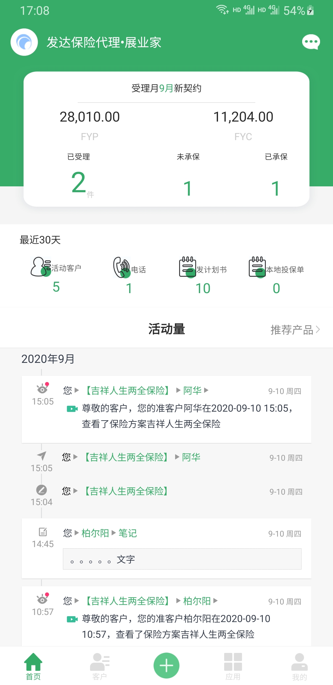 ❖ 活动量管理:首页的活动量看板,能自动生成客户活动记录,包括打过的电话、做过的记录、发送的计划书、上传的附件等,帮你做好活动量的数据统计。