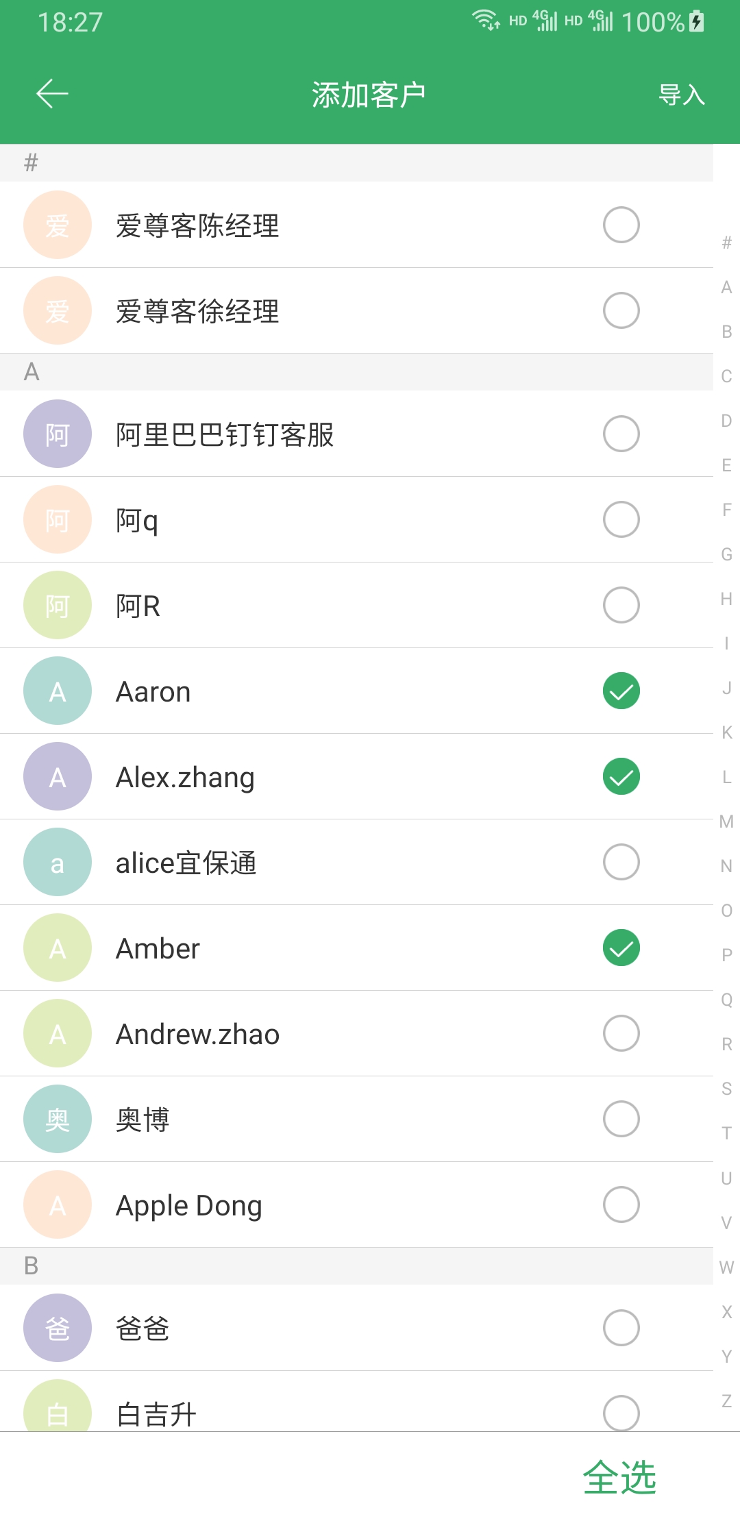 点击右上角的“通讯录录入”,可以逐个点击手机通讯录中的名字一个一个添加,也可以点击右下角的“全选”,然后点击右上角的“导入”,实现一键导入。