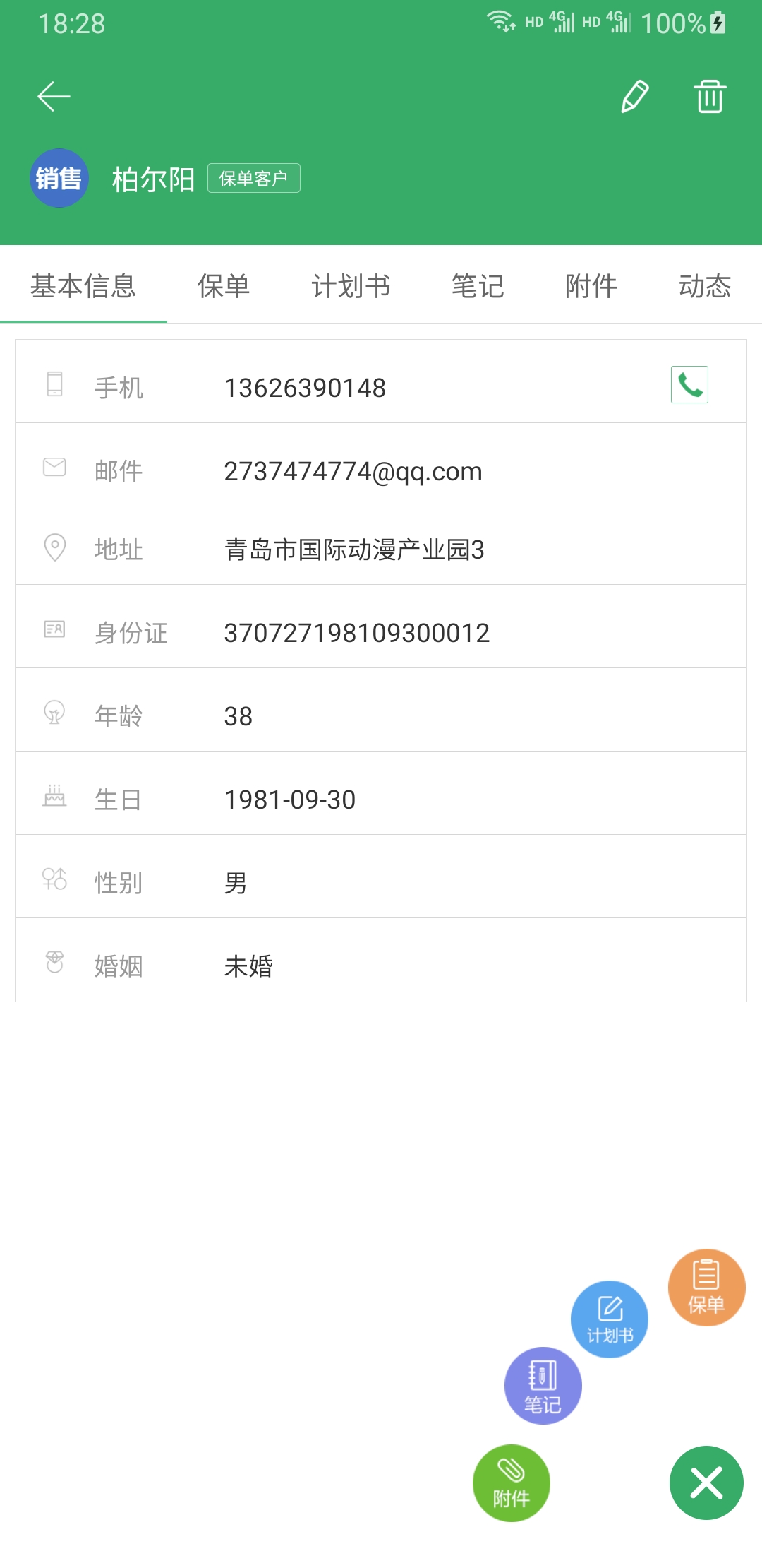 基本信息的添加:右上角有两个标签,一个是铅笔模样的,点击可以进行基本信息的修改或添加;一个是垃圾桶模样的,点击可以删除本条客户的全部信息。 保单信息的添加:点击右下角的“+”号,会跳出 4 个选项“保单”、“计划书”、“笔记”、“附件”,点击“保单”即可进行保单信息的添加。