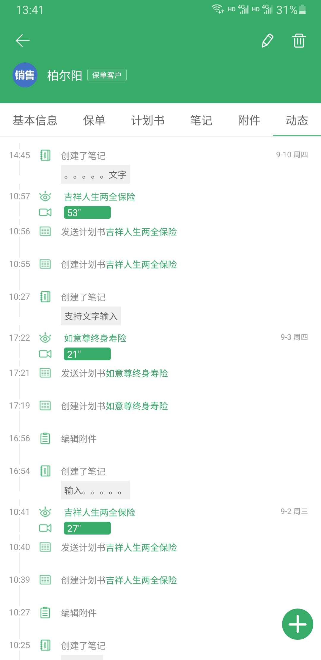 最后一个菜单:动态,点击之后,可以看到自动记录下来的客户情况,包括修改的基本信息,添加的附件和计划书等。