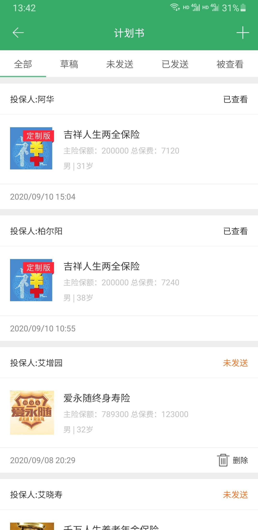 点开之后,可以看到全部状态的计划书情况,包含“未发送”和“已发送”的计划书。点击右上角的“新建”,就可以制作计划书。如图所示: