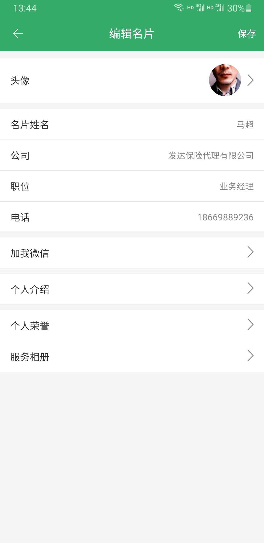我的名片可以帮助代理人设计自己的电子名片,可以通过微信的方式线上传播。使用路径:我的-我的名片,点开以后进入名片预览、分享和编辑页面,如图所示: