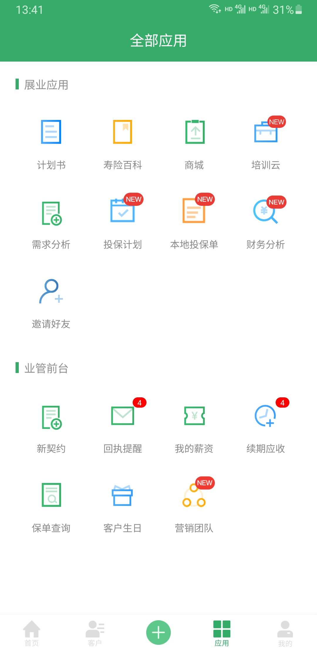 展业应用中会包含如下菜单:计划书、寿险百科、培训云、投保计划、本地投保单。(实际菜单数量与公司开通的功能板块有关,开通和隐藏由公司总部决定)
