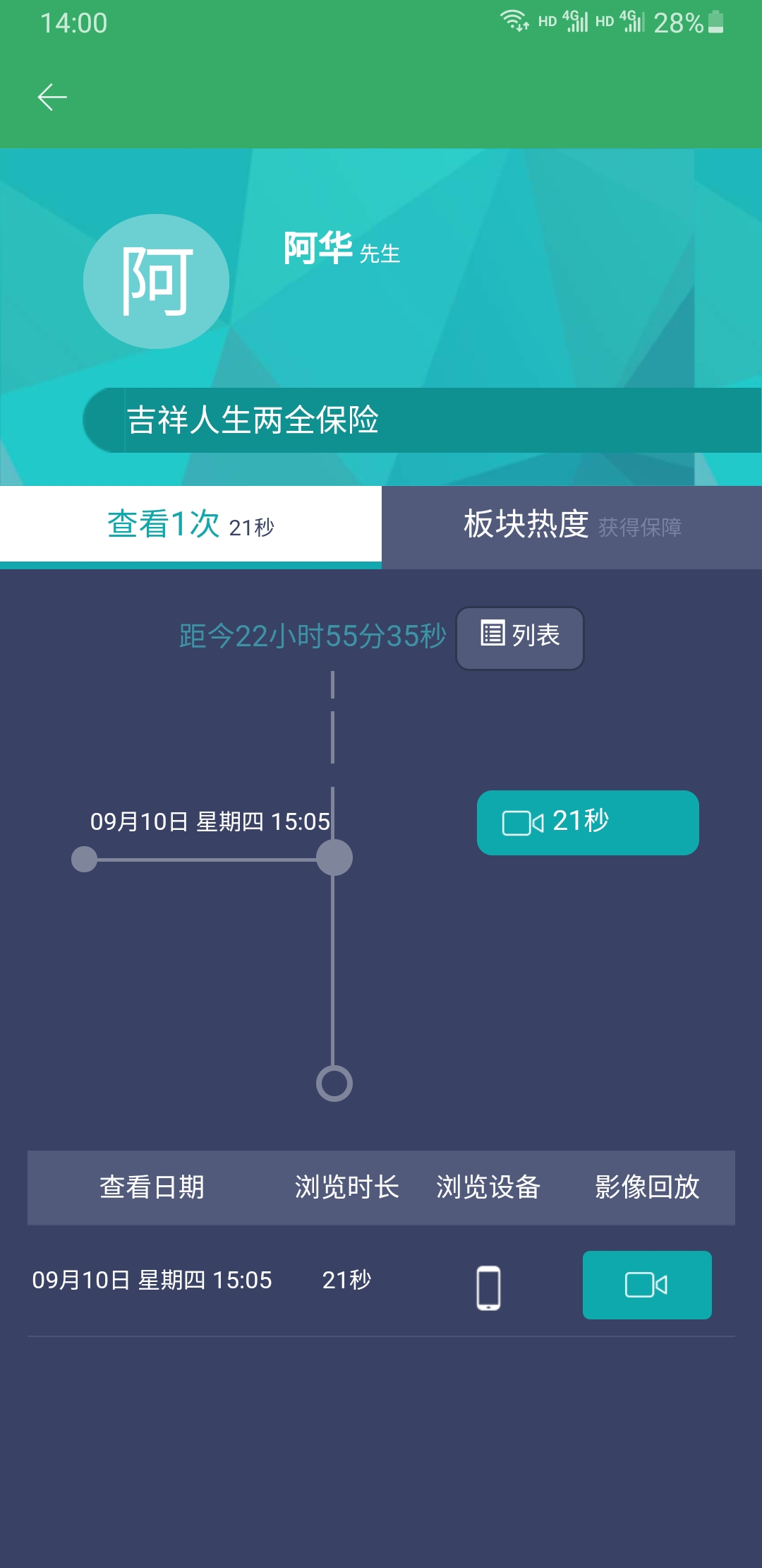 可以查看客户查看计划书的全过程,包含查看的时间,查看的次数,查看板块热度分析,客户查看的影像视频。