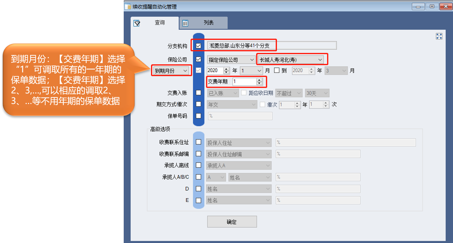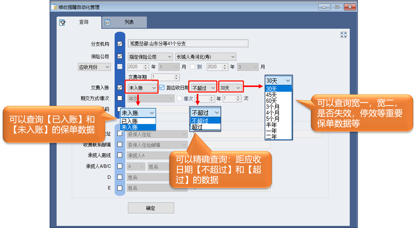 续期自动化作业可以按照应收月份、不同的交费方式、孤儿单等条件提前查询一定时间段内的应收的保单,并可以一键完成批量添加续期交费的记录。