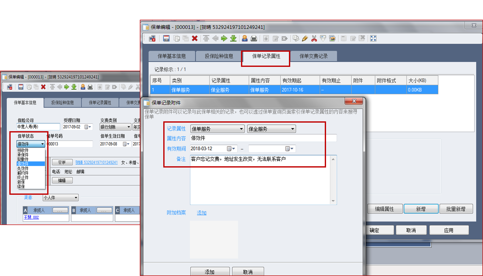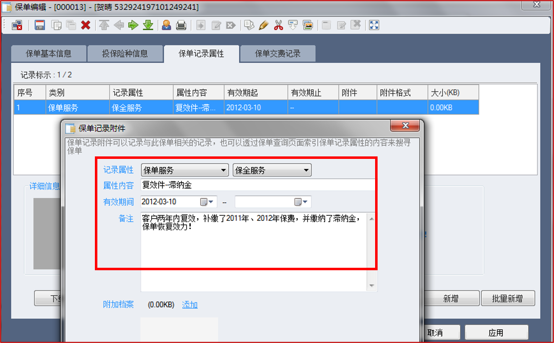 【保单】-【保单受理作业】-【保单号码】-【查询】-【保单记录属性】