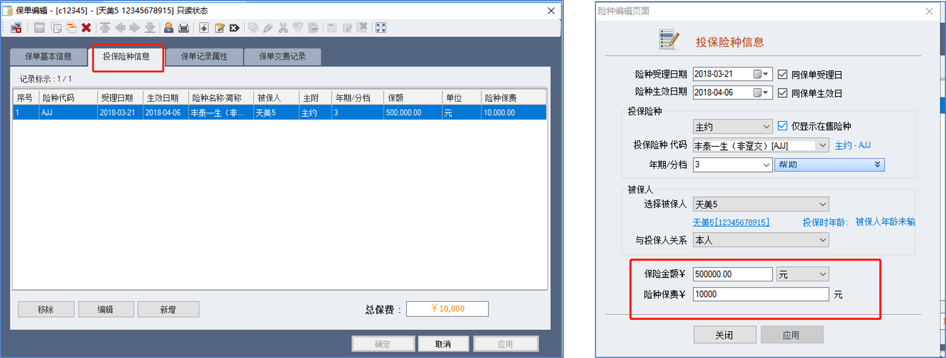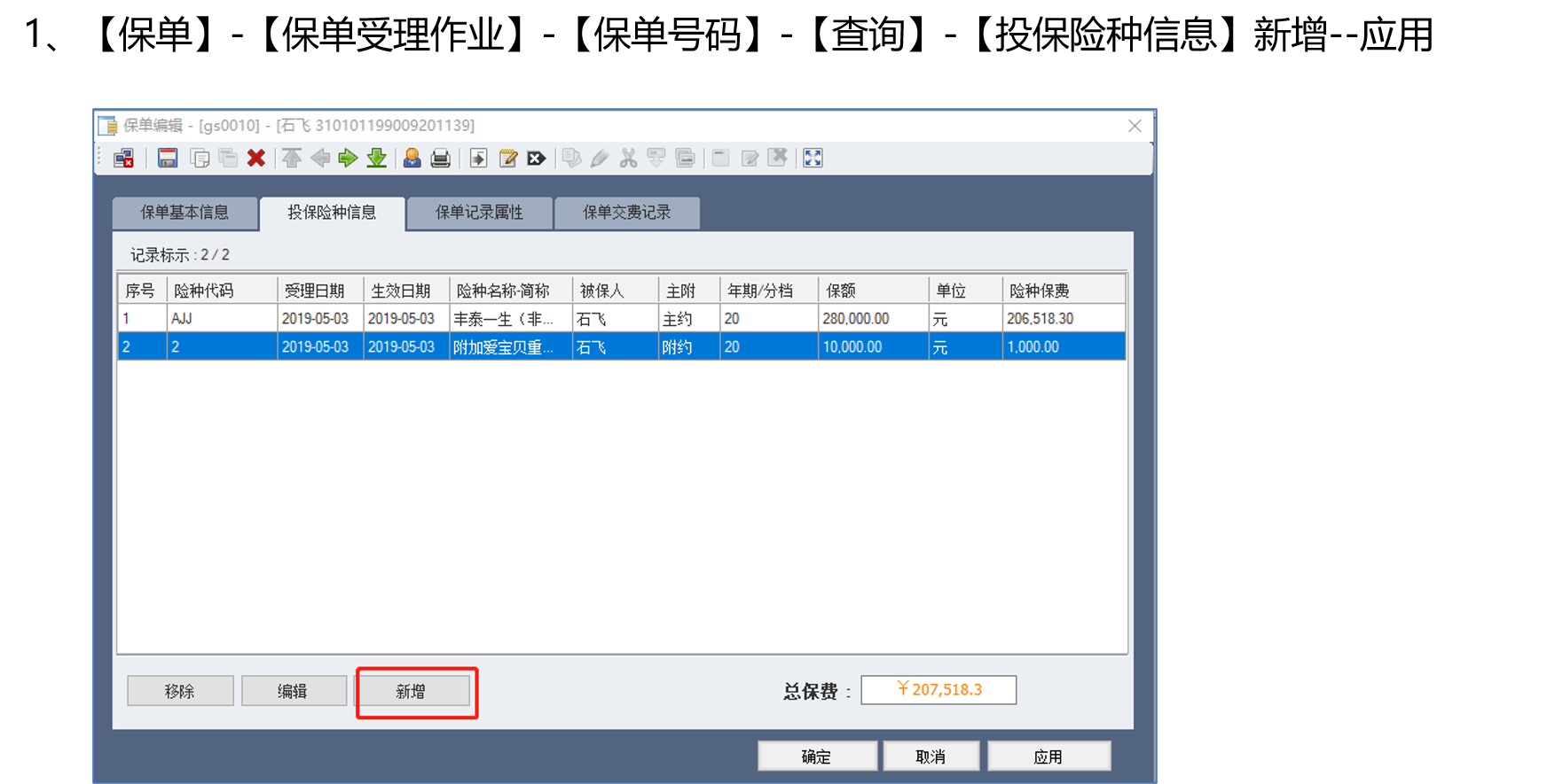 1、【保单】-【保单受理作业】-【保单号码】-【查询】-【投保险种信息】新增--应用