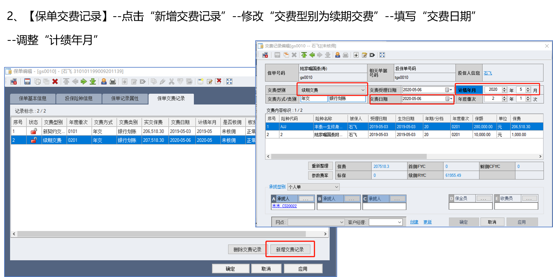 2、【保单交费记录】--点击“新增交费记录”根据实际情况调整