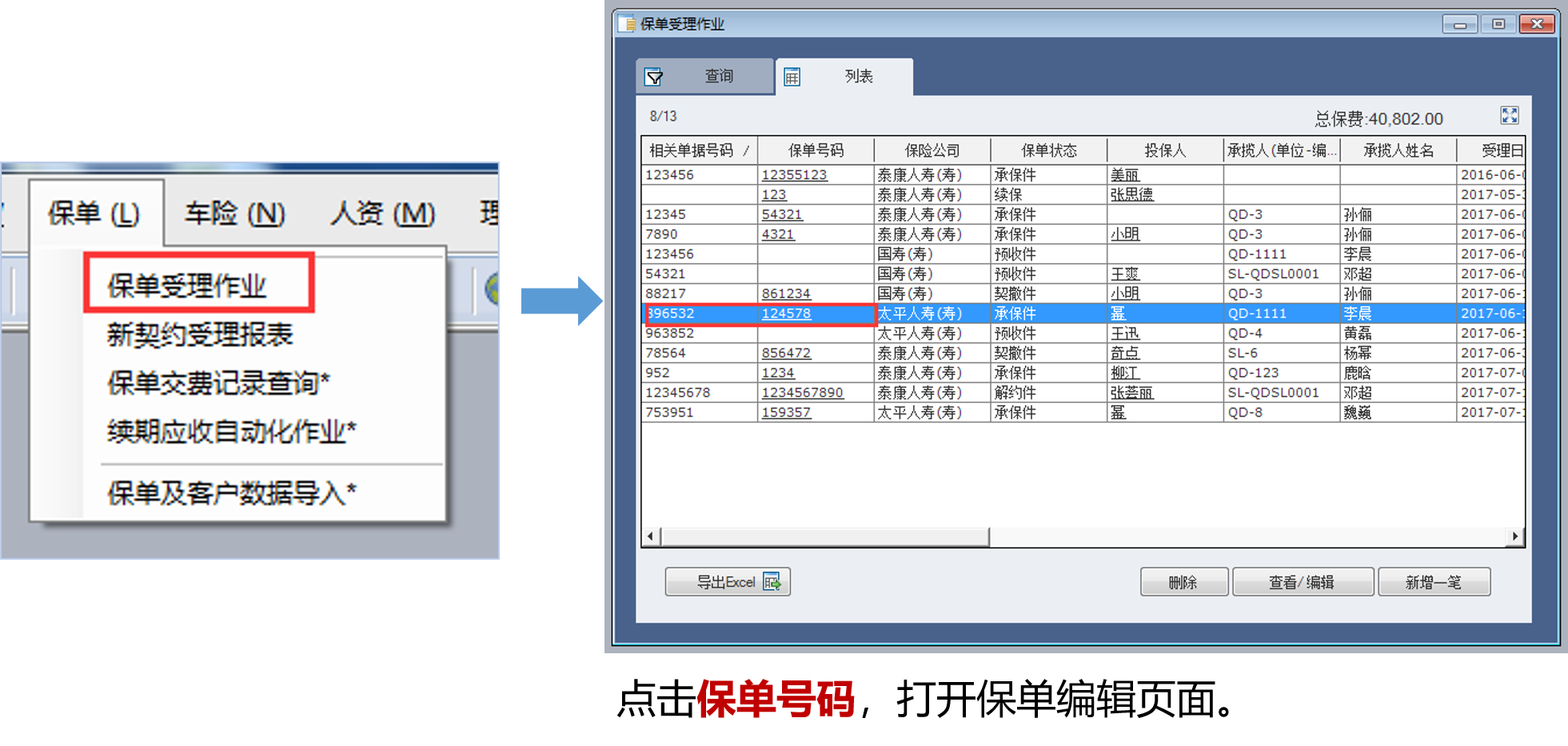 2.查询出来的结果点击【保单查看】按钮会直接获取这个人员做的保单数据可以进行相应的承揽人修改;
