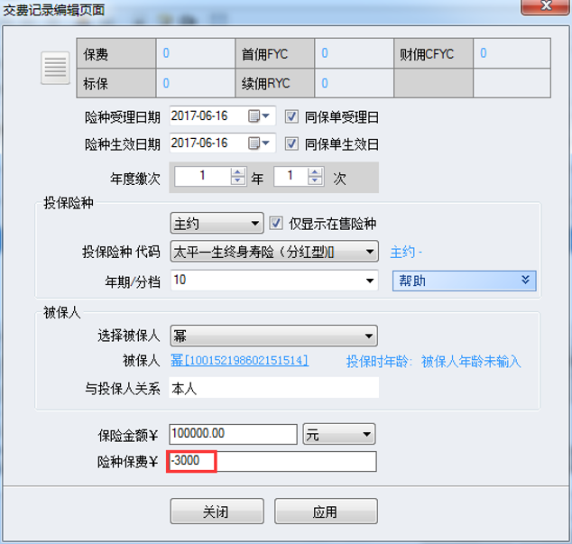 将保费修改为对应的负值,如3000元修改为-3000元。