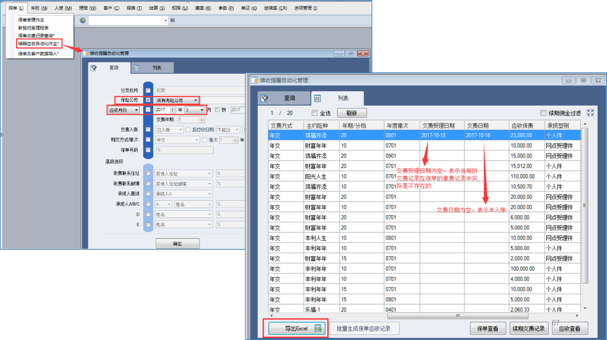 甲从系统中的【续收提醒自动化管理】模块中导出2017-03应收月的续期应收清单,并导出Excel,表中“交费受理日期”若为空,表示当前交费记录在保单的交费记录中实际是不存在的,若“交费日期”为空,表示“未入账”,将数据下发给续期催收负责部门或人员(此对口人统称之为乙);