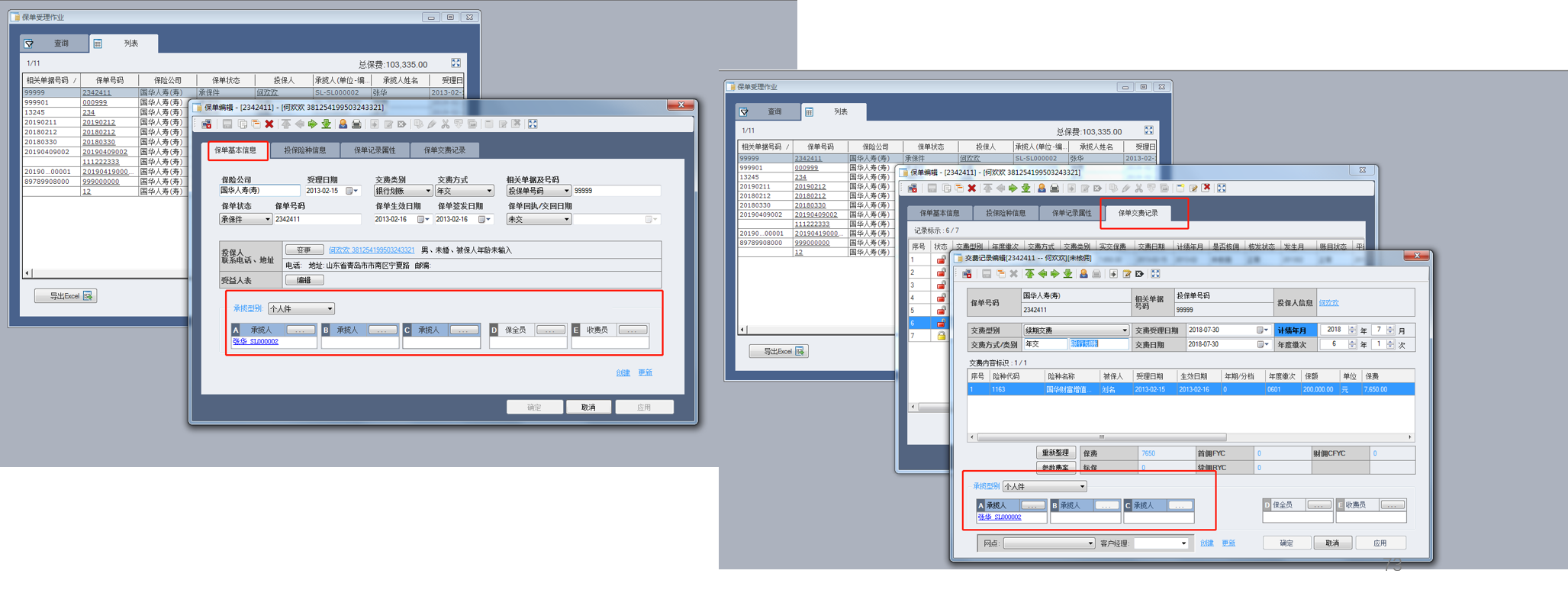 第二步:由内勤老师在核心系统中进行保单更改。搜索到原代理人的保单,逐笔更改,更改两部分的内容:保单基本信息页面和缴费记录页面;正确选择承揽型别:递归件,调整承揽人之后点击保存;操作完成。