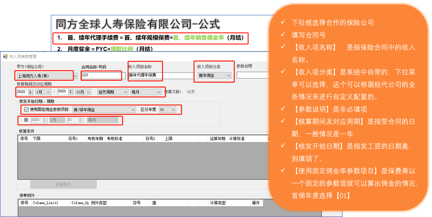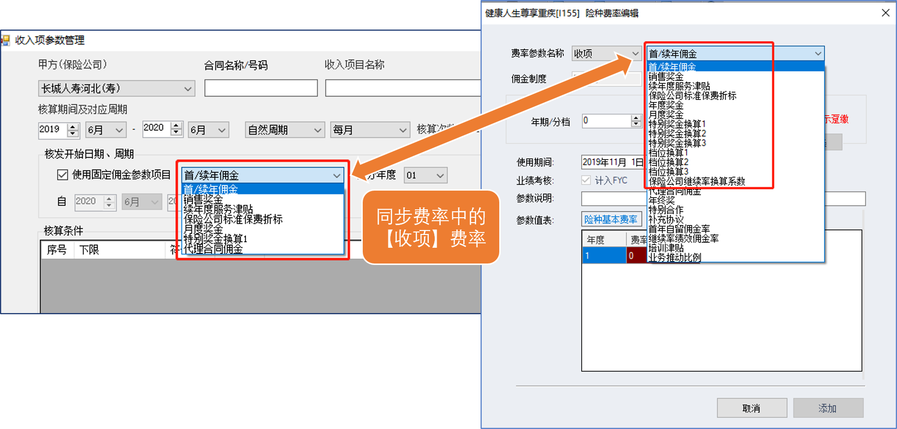【收入项参数管理】:根据保险公司与经代公司签订的代理合同,将用复杂公式计算的佣金项目转化为简易公式进行维护管理。