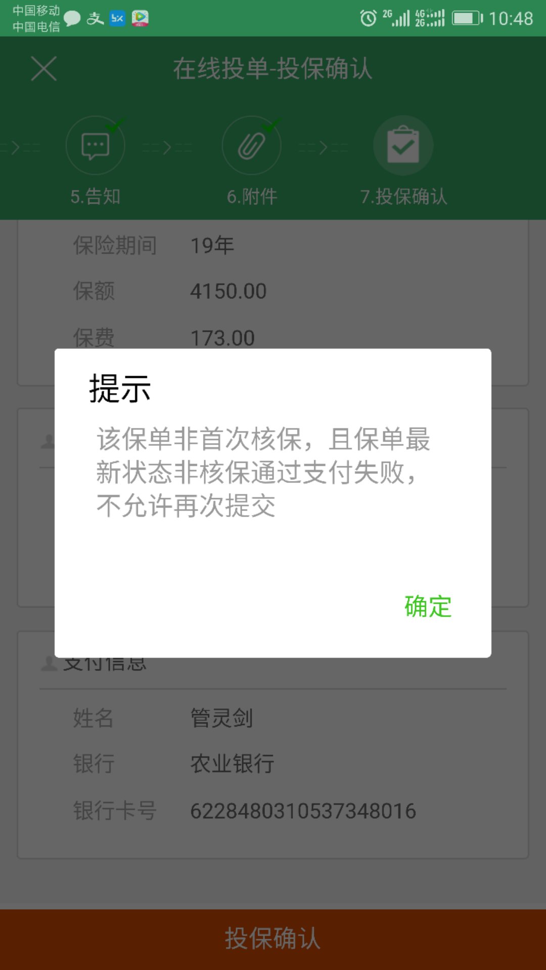点击投保确认后,系统提示