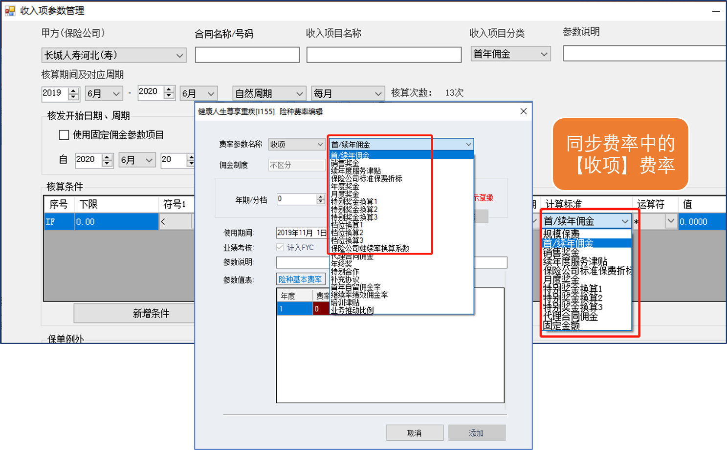 【收入项参数管理】:根据保险公司与经代公司签订的代理合同,将用复杂公式计算的佣金项目转化为简易公式进行维护管理。
