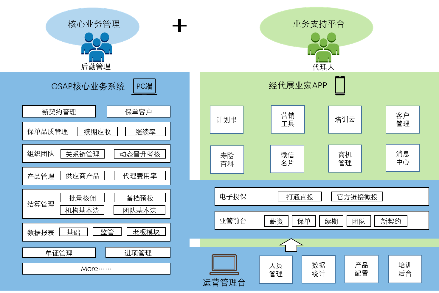 我们先来看看淞菱平台的整个架构,蓝色的部分是OSAP核心业务系统的架构,主要是给内勤老师使用的业务系统,负责人员管理的老师,负责新契约、续期保单的业管老师、结算老师等,这套系统财寿业务都支持,更加偏重于寿险业务。里面包含了新契约管理、续期保单管理、保单客户、保单品质管理、组织团队、产品管理、结算管理、各种数据报表(人资报表、新契约报表、工资报表等)、单证管理等等。再来看绿色的部分是经代展业家,主要是给外勤团队使用的手机APP,它涵盖了业务人员展业的全流程,从售前的客户管理、营销工具、计划书、寿险百科、商机管理到售中的电子投保,最后到售后的消息心、业务查询,其中业务查询中的数据都是来自于核心数据的,像工资查询、保单查询、续期查询、回执回访查询等。所以整个涵盖了售前、售中和售后的。最下面的模块是我们的管理台,您可以理解成为是手机端的后台,它可以统计有多少业务人员使用手机端、计划书的统计、活动量的统计情况,还可以配置产品和培训后台资料等。我们的产品的数据都是打通的,具有相关性的。