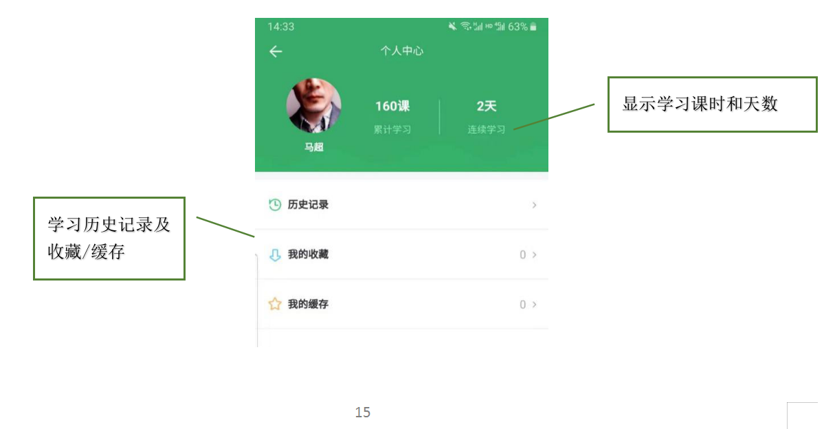 个人中心:学习的历史记录、累计学习课时、我的缓存等。